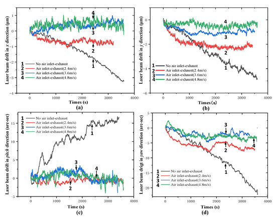 Figure 11 indicates that the laser beam drift without external temperature interference in the x direction is 0.4 μm and that in the y direction is 0.5 μm. As shown in Figure 12, the laser beam drift is gradually reduced with the increase of the pump’s current velocity. When the pump’s current velocity is adjusted to 4.8 m/s, the position stability of the laser beam spot is significantly improved. The laser beam drift in the x direction without air inlet–exhaust is 3.4 μm while that with air inlet–exhaust (4.8 m/s) is only 0.7 μm. Hence, in the mode of air inlet and exhaust, the position stability of the laser beam spot is improved by 79.41%. Similarly, in the y direction, the laser beam drift is 5.0 μm without air inlet–exhaust while that with air inlet and exhaust is 0.5 µm. The position stability of the laser beam spot with the air inlet and exhaust is improved by 90%. The position stability of the laser beam spot with air inlet and exhaust is evidently improved in the pitch and yaw direction. The experimental results are summarized in Table 2.