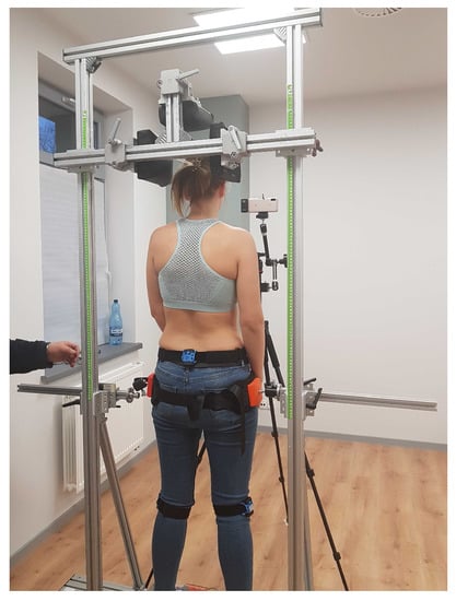 Next, the participants were placed in a cage for exercises in the standing position (Figure 2). After securing the subject in the system, he or she performed 3 consecutive exercises with different degrees of difficulty depending on the muscles activated: