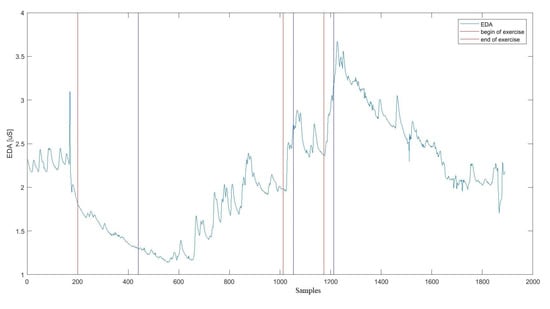 The first step in processing the EDA signal was to divide it into time segments based on time markers marked each time on E4 devices at the beginning of a given activity according to individual stages of the research protocol (Figure 3). For each part of the signal (Figure 4), the following statistical indices were determined: mean, standard deviation, median, variance, 25th and 75th percentiles, quartile deviation, minimum and maximum values during a specific activity, the fourth and fifth-order moments, skewness, kurtosis, root mean square error, total sum, entropy, coefficient of the slope of the regression line allowing to determine the trend-signal tonicity, coefficients of the regression line shift, distance from the values for individual EDA samples from the regression line, number of signal intersections with the regression line. These indices have been emphasised in the literature as important for EDA signal analysis [,,,,,,].