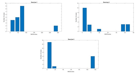 This method was used to determine WCSS for each variable independently for fragments of signals from individual exercises and for the entire signal collected (Exercises 1–3). The threshold was selected based on the histogram analysis of the obtained results (Figure 7).