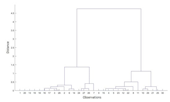 The first method of data division was an agglomerative hierarchical cluster tree [] using different metrics of the distance between pairs of observation: Euclidean, Spearman’s rank correlation coefficient, and the correlation calculated as the difference between the maximum correlation and the value of the local correlation between two consecutive points. The clustering algorithm formed data clusters based on similarities between observations. During the first iteration, each observation formed a single-element cluster, and in the next step, the two clusters closest to each other were merged, thus creating an agglomeration. In this type of clustering, the algorithm moved up the hierarchy until it divided the data into the required number of clusters (Figure 8).