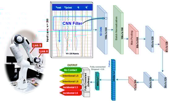 For contact detection, a deep network, which is shown in Figure 2, is proposed. In this scheme, a 1D-CNN, which is a multi-layered architecture with each layer consisting of few one-dimensional convolution filters, is used. In this research, just two links of the robot which are more likely to be used as contact points during physical human–robot collaboration, considered which indeed does not influence the general approach used in this paper. Therefore, it includes one network for classification of 5 states, which were defined as: