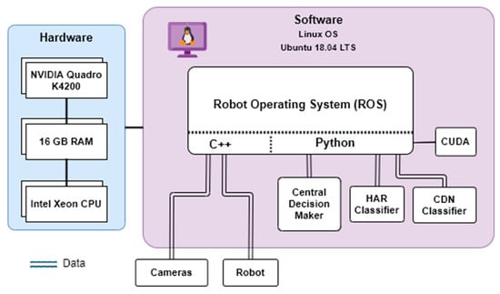 The real-time interface for collecting the dataset and implementing the trained network on the system was provided by Robotics Operating System (ROS) on Ubuntu 18.04 LTS. Figure 3 shows the hardware and software structure used in this work. Two computers execute the vision networks for each camera separately and publish the action states at the rate of 200 Hz on ROS. Furthermore, CDN and CDM are executed on another PC at the same rate, connected to the robot controller for receiving the robot torque, velocity, and position data of joints 5 and 6.