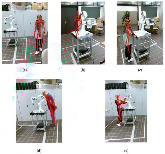 where (Cxrgb, Cyrgb) and (Cxd, Cyd) are RGB and depth image centers, respectively. PD shows the number of pixels per degree for depth and RGB images, respectively equal to 7 × 7 and 22 × 20 [,]. Then, the RGB images, which are supplemented with the skeleton representation in each frame, are collected as a dataset. The sample rate by considering the required time for saving the images was 22 frames/second. Both cameras start collecting data once the human operator enters the environment, while it is assumed that the robot is stationary in a structured environment. The collected images are then sorted into 5 different categories and labeled accordingly based on the skeleton position and configuration and with respect to the fixed base position of the robot.
