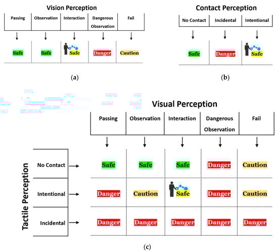 Safety perception spectrum in (a) visual perception, (b) contact perception, (c) mixed perception safety systems.