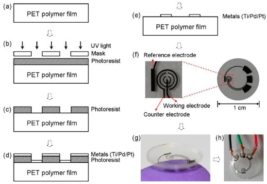 The sensor fabrication process and results: (a) a clean PET substrate is prepared; (b) the substrate is covered with a photoresist and exposed to UV light through a mask; (c) the photoresist is developed; (d) thin metal films are evaporated on the sample; (e) after lift-off, the metal pattern remains on the surface. After this step, the sensor is cut out of the polymer substrate and heat molded to the contact lens shape and functionalized with enzymes; (f) images of a sensor after it has been cut out of the substrate; (g) image of a completed sensor after molding held on a finger; (h) the sensor hardwired for testing. Reproduced from [5] with permission from Elsevier.