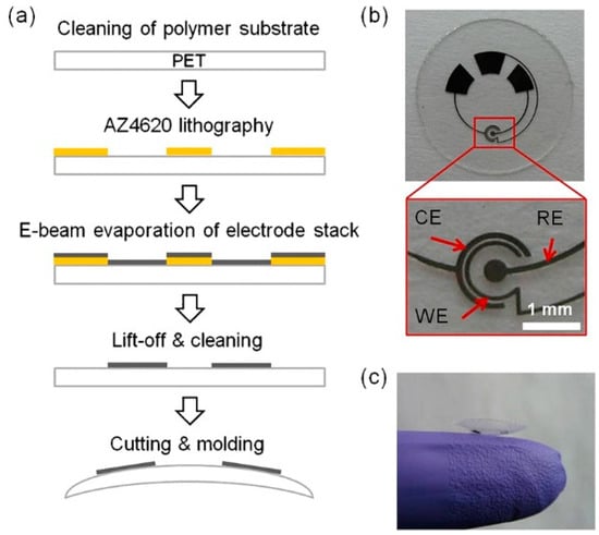 Lactate sensor on a contact lens. (a) Schematic representation of the assembly process for sensors on a transparent PET substrate which is molded to a contact lens. (b) Flat substrate with sensing structure, interconnects and electrode pads for connection to the external potentiostat; WE—working electrode, CE—counter electrode, RE—reference electrode. (c) A completed contact lens sensor held on a finger. Reproduced from [43] with permission from Elsevier.