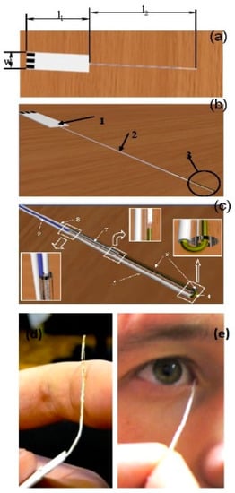 Schematic view of the flexible non-invasive micro-biosensor. (a) l1—length of a handle (from 10 mm up to 50 mm, optimum 20–30 mm), l2—length of a flexible sampling part (from 40 mm up to 100 mm, optimum is 50–60 mm), w—width of the handle (from 5 mm up to 10 mm). (b) 1—the handle with three electrical contacts, 2—the flexible sampling part (total diameter from 0.05 mm up to 0.5 mm), 3—the flexible part of the device with a microcell. (c) Flexible part of the sapling device including a microcell. 4—working electrode (diameter from 0.01 mm up to 0.2), 5—insulated part of the working electrode, 6—polymeric tube (internal diameter from 0.015 mm up to 0.25), external diameter from 0.02 mm up to 0.4, length from 1 up to 40 mm) fused to the insulated part of the working electrode, 7—counter and reference electrode (diameter from 0.01 mm up to 0.2 mm), 8—insulated part of counter and reference electrode, 9—checking/control electrode (diameter from 0.01 up to 0.2 mm). Distance between ends of working and opposite electrodes from 0.01 mm up to 1 mm. (d) Photograph demonstrating the flexibility of the biodevice. (e) Photograph of authentic sampling. Reproduced from [47] with permission from Springer.