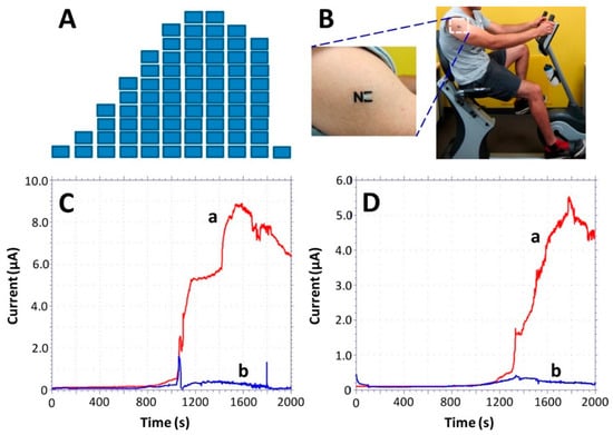 Monitoring of sweat lactate during 33 min of cycling exercise while adjusting the work intensity. (A) Exercise resistance profile on a stationary cycle. Subjects were asked to maintain a constant cycling rate while the resistance was increased every 3 min for a total evaluation of 30 min. A 3-min cool down period followed the exercise. (B) An “NE” lactate biosensor applied to a male volunteer’s deltoid; (C,D) Response of the LOx- (a) and enzyme-free (b) tattoo biosensors during the exercise regimen (shown in part A) using two representative subjects. Constant potential, 0.05 V (vs. Ag|AgCl); measurement intervals, 1 s. Reproduced from [140] with permission from the American Chemical Society.