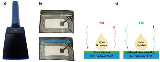 Biosensors based on oxidases are one of the well-known biosensors for the detection of bioanalytes in urine. These sensors detect the H2O2 generated, which can be used to estimate the concentration of the particular analyte [174]. The most common enzyme used for the detection of glucose in urine is, as in other cases, GOx [175]. One of the methods used for the detection of glucose in urine using amperometric biosensors is exploitation of conductometric biotransducer, which gives a binary response, when the analyte is present in urine. The working principle is based on a Prussian blue-cellulose acetate layer modified with GOx. When the substrate is present, H2O2 is formed, reacting with the layer (Figure 8). The reaction leads to the change of conductivity of Prussian blue-cellulose acetate layer making it possible to estimate the presence of glucose using a wireless biosensor [176]. Another reported method used for determination of glucose in urine is based on amperometry by using redox mediators and a bi-enzyme system. The measurement can be achieved by compressing electrically conductive carbon with the strip of a biosensor simultaneously having two redox mediators, i.e., an enzyme system for the oxidation of glucose, and silver/silver chloride reference electrode. The analysis readout can be achieved by applying a drop of urine on a sensor, where the result is compared with a standard calibration curve or by converting the current flow to some units of urine glucose levels [177].