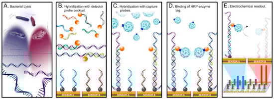 One of the most common bacterial infections, which poses a significant healthcare problem, is urinary tract infection (UTI). The standard culture-based diagnosis of UTI has a typical lead time of several days, and in the absence of microbiological diagnosis at point of care facilities, physicians frequently initiate broad-spectrum antibiotic treatment, thus contributing to the emergence of resistant pathogens. The powerful diagnostic platforms for infectious diseases are based on biosensors. For instance, an interesting example of a biosensor for uropathogen identification is the UTI Sensor Array (Figure 9) [181,182]. An electrochemical sensor array customized with bacteria specific DNA probes as recognition elements represents the sensor-platform. Each of the 16 sensors is modified with a self-assembled monolayer, which allows versatility in surface modification and, simultaneously, reduces background noise [183]. On the surface of the sensor, a library of DNA probes targeting the most common uropathogens is immobilized [184,185]. The detection protocol is based on conversion of hybridization events into quantifiable electrochemical signals.