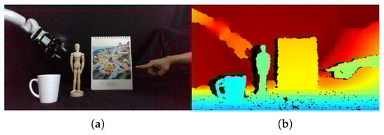 An example of 3D human–robot interaction. (a) The RGB image lacks 3D information, and it is difficult to distinguish which object the hand refers to. (b) The depth image encodes the distances from objects to the camera. It is easy to infer that the hand refers to the wooden puppet according to the depth image.