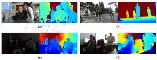 Hands play an important role in people’s daily activities. Hand detection is a key component in many computer vision applications, such as human–computer interaction [1], hand pose estimation [2,3,4], hand gesture recognition [5,6], activity analysis [5], and so on. Most existing works [7,8,9,10,11,12] focus on 2D hand detection from a single RGB image which lacks 3D information and leads to incompetency for 3D hand detection. However, the real world is of 3D by nature, and the RGB image based methods cannot meet the increasing requirement of 3D human–computer/robot interaction [13]. For example, in a robotic teaching scenario, there would be ambiguities in inferring the target from a single RGB image (see Figure 1a). Therefore, it is necessary to fuse the RGB image with 3D representations extracted from the depth image to enable 3D hand detection. (In this paper, we focus on 3D hand detection in unconstrained environments. For other related technologies such as the estimation of hand joints and action recognition, please refer to our previous work [2,3,14]).