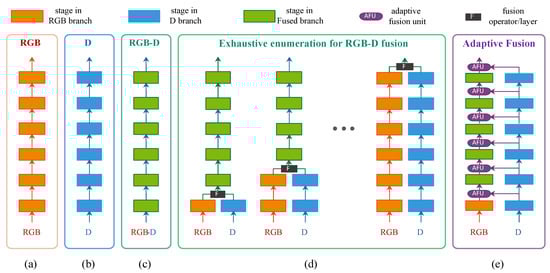An illustration of different fusion schemes: (a) network for RGB channels, (b) network for D channel, (c) directly concatenation of RGB-D channels, (d) an exhaustive enumeration of fusion levels [20], and (e) our proposed adaptive fusion network (AF-Net). Noted that the figure is for illustrative purpose, and the actual number of stages in networks may vary according to different network architectures.