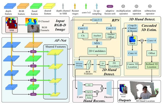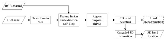 The flowchart of the proposed approach is shown in Figure 5. Firstly, the D-channel is transformed to SSR, and then SSR and the RGB-channel are fed into AF-Net for feature fusion and extraction. Secondly, the extracted shared features are fed into RPN for region proposal, and then 2D hand detection is conducted. Thirdly, based on the detected 2D hand location, we estimate the 3D hand location using cascaded 3D estimation. Additionally, the dotted arrow pointing to hand reconstruction means that we reconstruct hand while training, and do not reconstruct hand while evaluating. The details of the above modules will be addressed as follows.