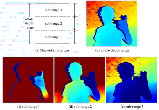 To tackle this problem, the single channel raw depth image is transformed into a multi-channel representation called Stacked Sub-range Representation (SSR), as the normalized local depth representation on hand can be enhanced by reducing the span of each sub-range (see Figure 6c). Let denotes the whole depth range, and denote the min and max values of R respectively. We evenly divide R into k adjacent sub-ranges, , , …, . The spans of sub-ranges are expanded with an overlap of 400 mm between adjacent sub-ranges, so that the integrity of hands can be ensured. To normalize each sub-range, given a depth value , its corresponding value in i-th sub-range is normalized as follow,
