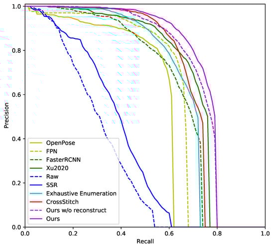 The following methods are compared in this paper: (1) OpenPose [66] which is an excellent human detection approach widely used by community. (2) FPN [61]. (3) FasterRCNN [67], the backbone of our approach. (4) Xu2020 [12]. (5) Raw, which denotes depth image based detection using raw depth representation. (6) SSR, which denotes depth image based detection using SSR representation. (7) Exhaustive Enumeration, which denotes our implementation of [20]. (8) Cross-stitch, which denotes our implementation of the cross-stitch unit [55]. (9) Ours w/o reconstruct, which denotes our proposed AF-Net based approach without the reconstruction module. (10) Ours, which denotes our approach with the reconstruction module. The precision recall curves of these methods are shown in Figure 7.