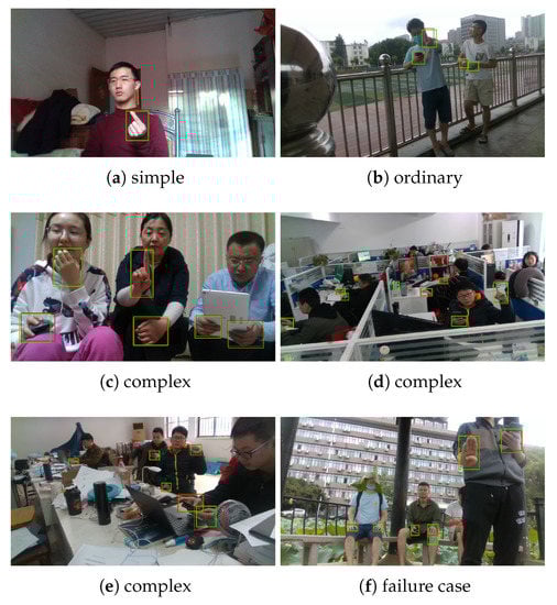 The qualitative hand detection results are shown in Figure 9. Our proposed approach reliably detect multiple hands in unconstrained environments. In Figure 9, the green boxes denote the detection results of Ours, and the red boxes denote the ground truth labels. We observe that most of the hands are correctly detected, as the green boxes precisely cover the corresponding red boxes. Failure cases are shown in Figure 9f: A green box covers its corresponding red box, but the IoU between these two boxes is low, so that it is counted as a false detection; a red box is not covered by any green box, and it is counted as a missing detection. Figure 9f shows that, there would be false or missing detection when the hands are partially occluded by other skin color body parts.