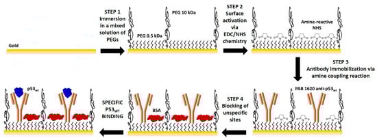 Prior to functionalization, the EG gold electrode was cleaned with H2O2 (Merck Millipore, Darmstadt, Germany) under ultraviolet (UV) light for 30 min, according to the so-called liquid-based hydrogen peroxide-mediated UV-photooxidation (liquid-UVPO) technique []). Then, it was rinsed with deionized water and dried with nitrogen. The biofunctionalization procedure (Figure 2) was performed essentially in agreement with that reported by Tarasov and coworkers []. It consists of four steps, each one separated by the following by rinsing the EG surface with phosphate-buffered saline (PBS) 1X (147 mM) solution at pH 7.4 for 15 min, to remove unbound molecules, successive rinsing with filtered (0.2 μm filtering membrane pore size) deionized water, and drying by pure nitrogen. First, the EG electrode was incubated with a mixed solution of SH-PEG-COOH (0.5 kDa; Biochempeg, Watertown, MA, USA), and SH-PEG (10 kDa; Merck Millipore), at a concentration ratio of 40 μM to 2 μM, respectively, in PBS 1X solution at pH 7.4, for one hour at room temperature. Furtherly, it was incubated with N-ethyl-N′-(3-(dimethylamino) propyl) carbodiimide (EDC) and N-hydroxysuccinimide (NHS), both purchased from GE Healthcare (Uppsala, Sweden), at 0.4 M/0.1 M ratio in PBS 1X solution at pH 7.4, for 20 min at room temperature. Then, the EG electrode was incubated overnight at 4 °C with the target-capturing p53 antibody (mouse monoclonal anti-p53wt, PAb1620 clone antibody; Merck Millipore) at a concentration of 13 nM in PBS 1X solution at pH 7.4. Finally, to avoid nonspecific binding, the unbound sites on the electrode surface were blocked by incubating it with a 1 mg/mL bovine serum albumin (BSA; Merck Millipore) solution in PBS 1X solution at pH 7.4 for one hour at room temperature.