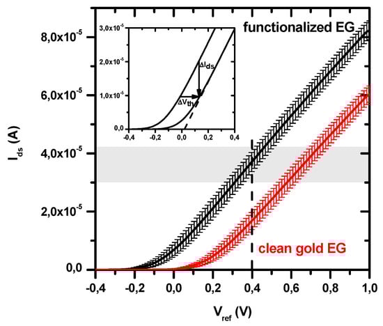 The threshold voltages (Vth) of the transfer curves have been obtained by applying a linear extrapolation method [], as shown in Figure 3 (inset). Their average values are (+160 ± 30) mV for clean gold EG electrode, and (−70 ± 40) mV for biofunctionalized gold EG electrode. These deviations from the zero-threshold which characterizes the commercial n-type MOSFET used, could be attributed to a combination of three possible effects: (i) the presence of the electrical double layer (EDL) which is formed in the electrolytic solution; (ii) the presence of the different molecules involved in the electrode functionalization; (iii) changes in the flat band voltage, somewhat correlated to the previous mechanisms [,]. In particular, the shift of the threshold (and obviously of the transfer curve) toward positive values, as observed for the clean gold electrode dipped in the electrolytic solution (see Figure 3), is indicative of the accumulation of negative charges at the EG electrode surface. Indeed, when an n-type MOSFET is used as transduction element, the accumulation of negative charges on the EG surface (and then on the FET gate) induces holes in the semiconductor channel and, thus, a decrease of Ids measured at a fixed Vref. Conversely, the threshold shift toward negative values, as registered for the functionalized EG electrode, implies the accumulation of positive charges at this electrode.