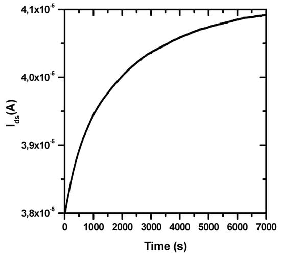 Drift of the Ids in BioFET could depend on leakage due to reference electrode microfabrication []. Indeed, we found some instabilities (not shown) in the gate voltage when our microfabricated Ag/AgCl pseudoreference electrodes (see Figure 1) were used. Therefore, we decided to use a much more stable bulky Ag/AgCl reference electrode [], as discussed in Section 2.2. In this case, the observed Ids drift can depend only on changes of the surface potential of the gate electrode, which affects the threshold voltage Vth in the transfer curve []. An analogous drift of Vth has been frequently observed when oxide materials (i.e., SiO2, Si3N4, Al2O3, Ta2O5) are used for the BioFET gate electrode and directly immersed in the electrolyte solution []. This initial current drift has been described in terms of a rate-limiting ion transport from the solution to buried sites on the gate surface, and the application of a dispersive transport model led to a power-law time dependent decay of diffusivity and mobility, consistent with a stretched exponential time dependence of the gate surface charge [].