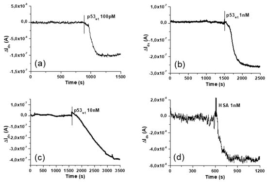 After current stabilization, the sensor response to p53wt has been tested by continuously recording Ids while injecting small volumes (20 μL) of p53wt solutions in the fluid cell. As shown in Figure 5a–c, p53wt solution injection induces a decrease of Ids, as due to a shift of the Vth towards positive values, as expected since p53wt bears a net negative charge at pH 8.0 []. Protein injections have been performed also by sequentially injecting increasing concentrations of p53wt. In this last case, at each step, the total Ids response (Ids shift with respect to the starting value) has been associated to the total p53wt concentration (as obtained by cumulating the different injections). Comparable current jumps are observed at the same p53wt concentration, either in single and in multiple injection experiments. Concentrations of p53wt from 50 pM to 10 nM have been tested, obtaining Ids jumps ranging from about −5.0 × 10−8 A up to about −5.0 × 10−7 A.