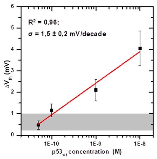 Calibration curve of the BioFET for the detection of p53wt, as obtained by plotting the average values of the threshold voltage (Vth) variation as a function of the p53wt concentration in PBS 100 mM pH 8.0, on a semilogarithmic scale. The error bars represent the standard deviation. The regression line (R2 = 0.96) is reported in red. From the slope of the regression line, the sensitivity σ = 1.5 ± 0.2 mV/decade is obtained. The grey area in the bottom represents the range of Vth variations obtained by injecting the working buffer with diluted other proteins (0.6 ± 0.4 mV), which can be considered as the blank signal.
