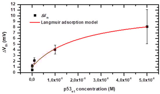 The experimental ΔVth as a function of Cp53 have been replotted, up to the saturation level (i.e., up to 50 nM), in linear scale, in Figure 7. As for Figure 6, the experimental errors could mainly originate from variability in the sensor microfabrication, solution preparation, volume injection and antigen concentration. In the measurements performed at 50 nM concentration, in addition to the variability induced by the above mentioned issues, it should be taken into account the variability in the sensor surface preparation, which become critical in the saturation regime, when the number of available binding site on the electrode represents an upper limit to charge accumulation at the gate surface. The data have been fitted with the proposed model (red line), obtaining a good match (R2 = 0.96). From the fitting analysis, an offset value of 1.0 ± 0.4 mV is obtained, which is consistent with the blank signal represented by the grey area in Figure 6. The dissociation constant of the interaction among p53wt and its conformational antibody PAb1620 is also obtained, as KD = (2.2 ± 1.3) × 10−8 M. This corresponds to an affinity constant KA = 1/KD ≈ 4.5 × 107 M−1 that is only slightly lower than those previously reported between p53wt protein and PAb241, PAb246 antibodies or consensus ds-DNA (6.9 × 108 M−1, 3.7 × 108 M−1 and 1.1 × 108 M−1, respectively []). Indeed, the monoclonal antibody we used (PAb1620) binds an epitope on the surface of correctly folded p53wt, and, upon binding, allosterically inhibits p53wt binding to DNA. However, it is highly sensitive to protein unfolding or mutation (even single aminoacidic mutation) and p53wt is known to assume different conformations, not all of which are recognized by PAb1620 []. This could partially justify the observed KD, which, on the other hand, has not been so far reported in the literature. An even lower affinity (KD = 3.5 × 10−6 M) has been reported by SPR for the binding of a peptide cloning the p53wt binding site to PAb1620 [].