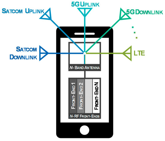 A possible solution to combat the lack of available space resulting from this growing incorporation of communication systems, is to develop a single antenna, operating in each frequency band, and shared by the various communication systems. Figure 1 clarifies the scenario referring to a mobile device where a single antenna structure interacts with multiple radio-frequency frontends, which can be one of the main characteristic nowadays, since even a common smartphone gathers multiple antennas, enabling the connection with the most varied services.