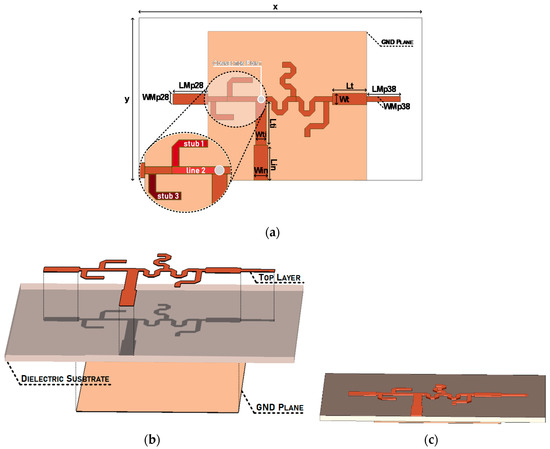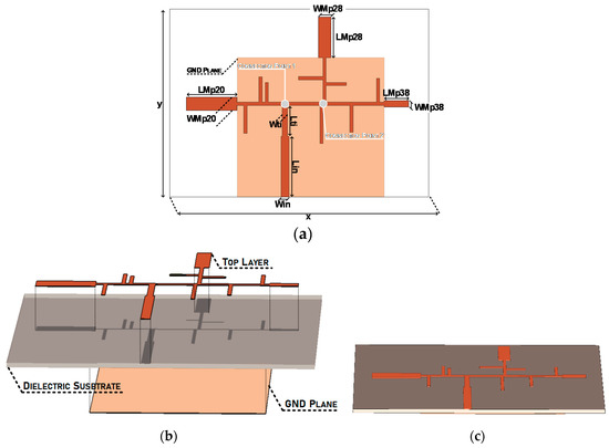 Figure 4 identifies the main design parameters of the dual-band structure. Two monopoles with dimensions LMp28 × WMp28 and LMp38 × WMp38 were designed. A 50 Ω impedance microstrip line, along with a quarter-wavelength transformer lead the input signal to the connection point referred above. Additionally, in order to maximize the structure’s compactness, meander lines were used for the greater stubs.