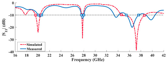 For this prototype, a good impedance matching was achieved, with both curves presenting a similar behavior despite some frequency shifts of 680 MHz and 410 MHz from the desired 28 and 38 GHz, respectively. These small discrepancies seen might be justified either by slight construction imperfections (which is something natural given the antennas’ small size). Nevertheless, the measured values of S11 at the operation frequencies are −13.64 dB and −16.94 dB, respectively, making of these results quite satisfactory.