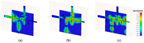 Figure 12 exhibits the respective results for the tri-band structure, denoting the surface current distribution for the three operating frequencies.