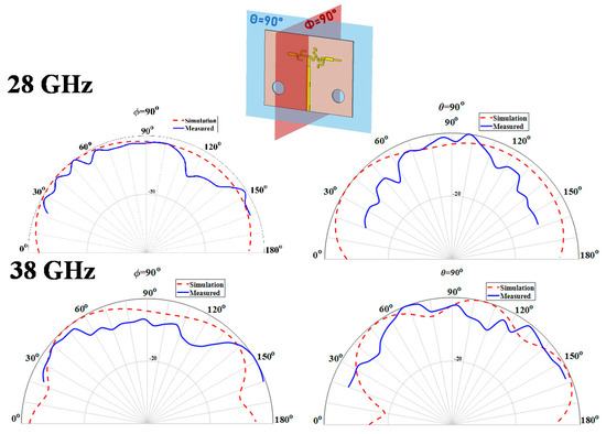 Regarding the gain of the antennas, in Figure 15 it is possible to observe the simulation and measured results of the two main radiation planes at both frequencies of interest, 28/38 GHz, for the dual band antenna.