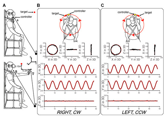 Cartesian coordinate data (x, y, z) were acquired with the 3D VR system at a sampling rate of 90 Hz. Each graph shown in Figure 1B,C represents a typical example in this experiment. The red line represents the movement of the target, while the black line indicates the movement of the tracer (Figure 1B,C). We calculated the radial position (R), phase position (θ), acceleration (a), and DSJ. R and θ are utilized for analyzing the tracking performance.