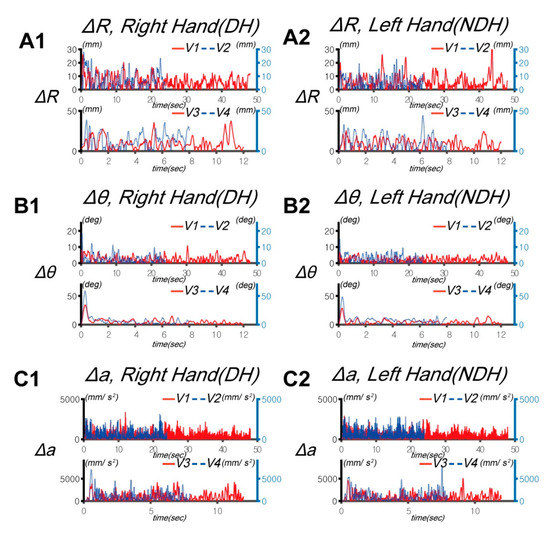 Typical examples of circular tracking movements at 0.125, 0.25, 0.5, and 0.75 Hz (V1, V2, V3, and V4, respectively). The trajectories of the circular tracking movements of the DH (Dominant Hand) on the frontal plane are indicated for the right hand (CW: A1, B1, and C1) and NDH (Non Dominant Hand) for the left hand (CCW: A2, B2, and C2): ΔR for the right hand (A1) and left hand (A2), Δθ for the right hand (B1) and left hand (B2), and Δa for the right hand (C1) and left hand (C2).