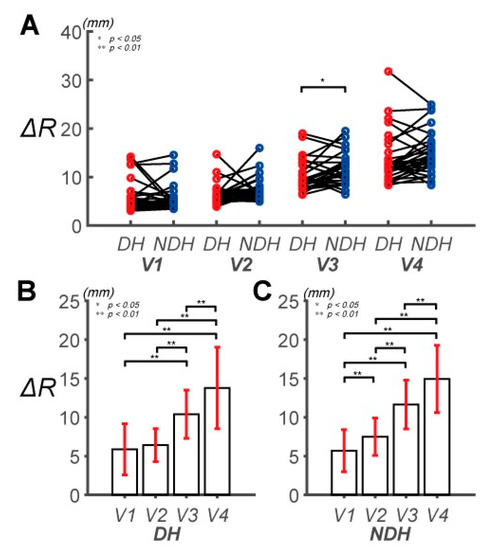 Pairwise comparison of the absolute mean radial position error (ΔR) between the DH and NDH. (A) Pairwise comparisons of ΔR between the subjects’ DHs and NDHs. The speeds of the target are denoted as V1, V2, V3, and V4. (B) Pairwise comparisons of ΔR across speeds for the DH. ΔR is 5.88 ± 3.30, 6.42 ± 2.12, 10.38 ± 3.11, and 13.78 ± 5.26 mm at V1, V2, V3, and V4, respectively. (C) Pairwise comparisons of ΔR across speeds for the NDH. ΔR is 5.69 ± 2.72, 7.49 ± 2.42, 11.65 ± 3.15, and 14.95 ± 4.33 mm at V1, V2, V3, and V4, respectively.