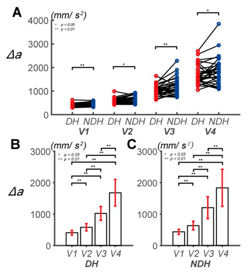 Pairwise comparison of the absolute acceleration error (Δa) between the DH and NDH. (A) Pairwise comparisons of Δa between the subjects’ DHs and NDHs. (B) Pairwise comparisons of Δa across speeds for the DH. Δa is 406.03 ± 76.14, 578.92 ± 115.52, 1020.77 ± 221.72, and 1679.28 ± 423.38 mm/s2, at V1, V2, V3, and V4, respectively. (C) Pairwise comparisons of Δa across speeds for the NDH. Δa is 434.83 ± 80.01, 635.29 ± 138.47, 1203.78 ± 349.08, and 1835.63 ± 589.77 mm/s2, at V1, V2, V3, and V4, respectively.