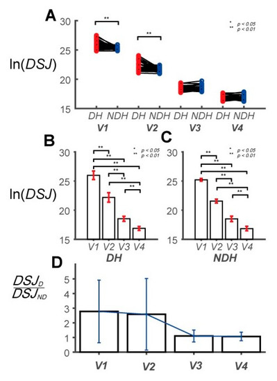 Pairwise comparison of DSJ and DSJ ratio between the DH and NDH. (A) Pairwise comparisons of DSJ between the subjects’ DHs and NDHs. The values are calculated using the natural logarithm. (B) Pairwise comparisons of DSJ across speeds for the DH. DSJ is 25.97 ± 3.26, 22.19 ± 0.82, 18.53 ± 0.43, and 16.87 ± 0.33, at V1, V2, V3, and V4, respectively. (C) Pairwise comparisons of DSJ between the speeds for the NDH. DSJ is 25.22 ± 0.23, 21.56 ± 0.32, 18.50 ± 0.46, and 16.84 ± 0.39, at V1, V2, V3, and V4, respectively. (D) DSJ ratio between the DH and NDH at each speed. The ratios are 2.78 ± 2.14, 2.58 ± 2.44, 1.10 ± 0.41, and 1.07 ± 0.29, at V1, V2, V3, and V4, respectively.