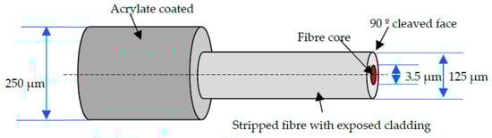 The majority of piezoelectric sensors are resonant systems operating over a narrow bandwidth of a few tens to a few hundred kHz [,]. Nonetheless, there are also wideband AE piezoelectric sensors which offer a flat response over a wider range of frequencies, normally up to 1 MHz. The attenuation of the AE signal with increasing distance is a consideration for all AE measurements. The level of attenuation depends on the material type as well as its geometry. A typical piezoelectric sensor is cylindrical in shape, with a diameter of 20 mm, height of 30 mm, and a weight of around 30 g []. Thus, embedding piezoelectric sensors in composite structures is not possible or practical. FOS are lightweight, with a small enough diameter (~250 µm) to enable them to be embedded into composite structures []. They can also be multiplexed so as to accommodate multiple sensors simultaneously [,,,,]. The typical dimensions of an optical fibre are shown in Figure 1.