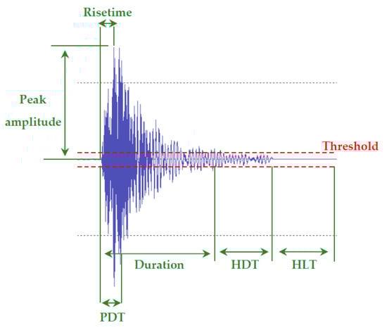 Effective AE monitoring requires that signals related to damage evolution are successfully separated from unwanted mechanical noise using appropriate filtering techniques. This is possible by amplifying the signal and filtering out the background noise using either appropriate hardware or software-based techniques. Post-processing of the acquired AE events allows the accurate evaluation of the detected damage modes. The main parameters for characterising the signals acquired include, rise time, peak amplitude, energy, duration and frequency content. The amplitude threshold during AE measurements is set so as to eliminate unwanted background noise. An additional parameter considered in damage monitoring of composite materials is the rise time-peak amplitude (RA) ratio. The RA ratio is a useful indicator of classifying damage types in composite structures []. The Peak Definition Time (PDT), Hit Definition Time (HDT), Hit Lockout Time (HLT), and maximum signal duration are timing factors that are required to be set according to the nature of the geometry of the material tested so as to enable the accurate detection and evaluation of any damage initiation and subsequent growth under mechanical loading. The Peak Definition Time (PDT) is an acquisition parameter that describes the elapsed time between the signal first exceeding the threshold to the maximum amplitude of a single event. Hit Definition Time (HDT) is the time that an event capture remains open after the signal has passed the threshold. Setting the HDT value low is particularly useful when testing a brittle material with many consecutive AE events. Setting its value too low, however, can adversely influence the maximum peak amplitude of the signal or result in unwanted signals to be acquired. Setting the HDT too high can result instead, in certain damage-related events being missed. The Hit Lock-out Time (HLT) is the time where the AE sensors do not record further signals after an event is recorded [,]. The HLT needs to be chosen such that echoes of a primary event are not recorded since they can be mistaken for actual damage events. On the other hand, if HLT is set too high, damage events can be missed since the sensors are not recording during this time. The maximum signal duration is the maximum duration that a recorded AE signal can have. If the recorded signal’s duration exceeds the maximum signal duration value set, then the sensors will stop acquiring and restart acquisition once the HLT has been exceeded. This is a useful parameter for avoiding continuous AE signals arising from background noise to adversely affect the AE measurement. Useful AE parameters are demonstrated in Figure 2.