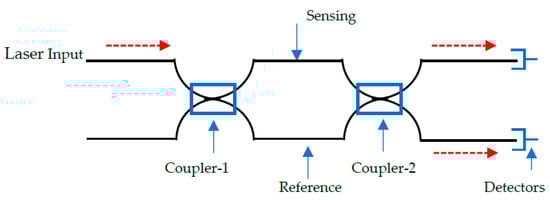 A Mach-Zehnder interferometer (MZI) consists of a laser input, beam splitter (coupler-1), two fibres (sensing/reference), beam combiner (coupler-2), and a detector. An external stress presented as a measurand, introduces an effect on the sensing fibre whose light intensity is compared with the reference fibre in a detector. The measurand changes the optical path length of the sensing fibre as the reference fibre remains constant. As such, the phase is a function of the different lengths between the sensing and reference fibre. It can be written as []: