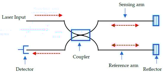 The optical path of propagating light from a single source is evaluated after splitting it into two components. One beam is defined as the reference parameter, whilst the other (sensing) wave guide responds to the application of mechanical or thermal stresses []. A typical setup for this sensor is shown in Figure 4 [].