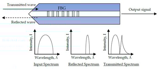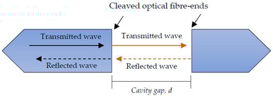 Furthermore, fibre Fabry-Perot sensors require the cladding/core to be accessed during manufacturing, as an optically flat fibre surface is preferred for maximum surface reflection. Although mechanical stripping is preferred for its speed, wet chemical etching is a reliable, cost-effective and simple alternative to mechanical etching during manufacture []. A micro-gap was created at a fibre end by a fast etching rate at the core, compared with the cladding. The miniature size of the gap was crucial for minimising transmission loses from the cavity. After etching, two fibres were spliced together with a short arc time and low arc power, which was preferred to avoid over-melting of the micro-gap []. Fibre Fabry-Perot sensors for AE consider local elastic stress waves inducing strain in the sensor. As such, acoustic waves periodically alter the dimensions of the FP cavity and cause the reflected light intensity to be modulated. This modulation amplitude usually depends on the optical wavelength and cavity length []. A schematic illustration of the Fabry-Perot sensing principle is displayed in Figure 6.