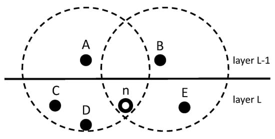 After the layering phase, each node will obtain their neighbor table T. In the neighbor table, all neighbors are classified as lower-layer neighbors (LNs) and higher-layer neighbors (HNs). As long as each node transmits packets to its LNs, all packets will eventually be transmitted to the sink node. Therefore, when node n has a packet to forward, it will choose several neighbors from its LN as the next-hop. Let express the forwarding set of n, where is the LN of node n. Node n is going to select one or more nodes from as its next-hop. Let selection strategy indicate the choice of node n to all LN in , where binary denotes the choice of node n. means node n will choose node j as its next-hop, and 0 otherwise.