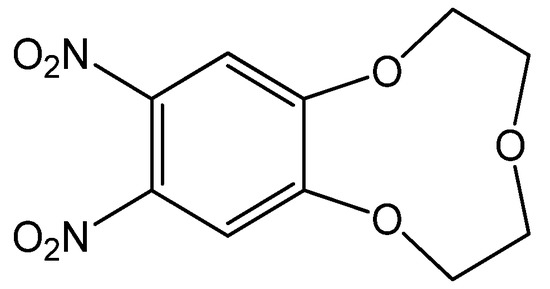 Compound 1 (benzo-9-crown-3-ether) was synthesized according to previously reported procedures [29]. Briefly, benzo-9-crown-3-ether (2.0 g, 1.1 mmol) in CH2Cl2 (50 mL) was added to glacial acetic acid (30 mL), and the mixture was stirred with one drop of 96% H2SO4. Afterward, 70% HNO (10 mL) was slowly added to the mixture, followed by stirring at RT for 1 h and refluxed for 4 h. After cooling to 0 °C in an ice bath, aqueous Na2CO3 was added to adjust the pH to 7. Following extraction with CHCl3, the organic solvent was evaporated, and the remaining extract was washed with a saturated NaHCO3 solution. The crude product was recrystallized from absolute ethanol, affording a pure product with a 59% yield after filtration and drying. MP: 94.5 °C; 1H-NMR (300 MHz), DMSO: δ 7.7 (s, 2H, ArH), 4.4 (m, 4H), 3.85 (m, 4H); MS: m/z (%) 270.20 (M+, 100).