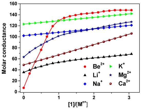 Conductometric titration curves for 1 with metal cations, obtained in 95% acetonitrile-DMSO (AN-DMSO) solution. The molar conductance Λm (S−1cm2mol−1) is plotted against [1]/[Mn+].