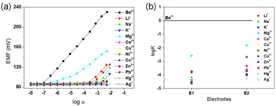 (a) Calibration curve of the fabricated Be2+ ion-selective electrode (ISE), consisting of the potentiometric response of E1 for various metal cations. (b) Potentiometric selectivity coefficients () for E1 and E2.