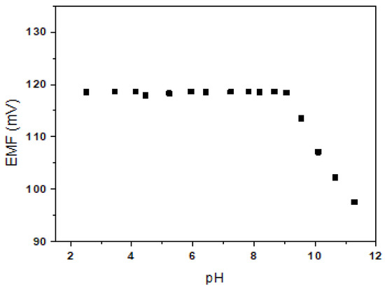 The effect of pH on the Be2+-ISE (E1) was tested in a 10−2 M BeSO4 solution over the pH range of 2.5–11 (adjusted with HNO3 or NaOH). As shown in Figure 4, the potential response was almost the same over the pH range of 2.5–9.0. The observed drift at higher pH values may be due to the formation of hydroxyl complexes with Be2+ ions in solution. Thus, the wide pH working ranges of the developed electrode E1 may be useful for selective Be2+ sensing in aqueous solution.