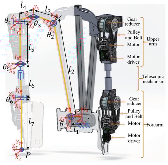 The exoskeleton was designed on the basis of the DOF of the human shoulder and elbow joints, and its overall design is shown in Figure 1. A single arm of the exoskeleton consists of six rotary joints and a telescopic mechanism. The specific design parameters are listed in Table 1. The combination of , , and  corresponds to the abduction/adduction of the shoulder,  corresponds to the flexion/extension of the shoulder,  corresponds to the internal/external angle of the shoulder, and  corresponds to the flexion/extension of the elbow. Finally,  and  correspond to the active joints, which can provide power assistance to the wearer. The others are passive joints, which can follow the wearer’s movements, and do not affect the wearer’s free movement. With the combination of active and passive joints, the exoskeleton could exhibit the necessary power-assist capability; thus, the number of motors was reduced, and the cost and weight were controlled. In the exoskeleton, the motors and reducers accounted for most of the weight. Carbon fiber materials were employed to fabricate the main structural parts to lower the weight; thereby, the weight of the two-arm prototype was reduced to 5.1 kg (excluding the weight of the batteries).