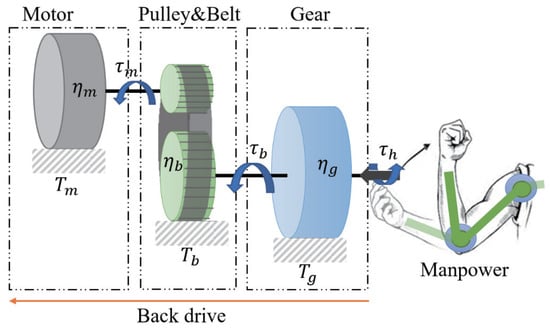 During backdriving, the gear reducer and timing-belt pulley can increase the speed in the system. Their backdrive transmission efficiencies are  and , and their reduction ratios are  and , respectively. When the wearer applies a torque () to the output shaft of the active joint (the output shaft of the gear reducer), the torque is transmitted through the gear reducer, and a torque () is generated to drive the timing-belt pulley. This in turn generates a torque () to the motor shaft after it passes through the timing-belt pulley set. During backdrive, the torques , , and  on each rotating shaft overcome the friction torques , , and  of the gear reducer, timing-belt pulley, and motor, respectively, to perform backdrive. The required input torque  can be expressed as follows: